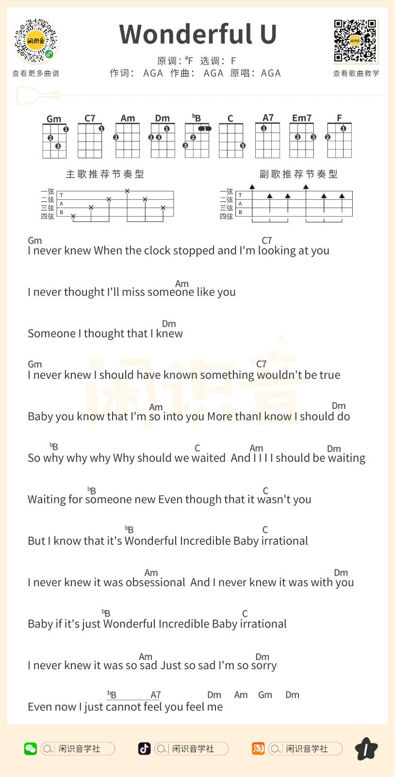 尤克里里AGA《Wonderful U》尤克里里谱弹唱版 F调和弦谱