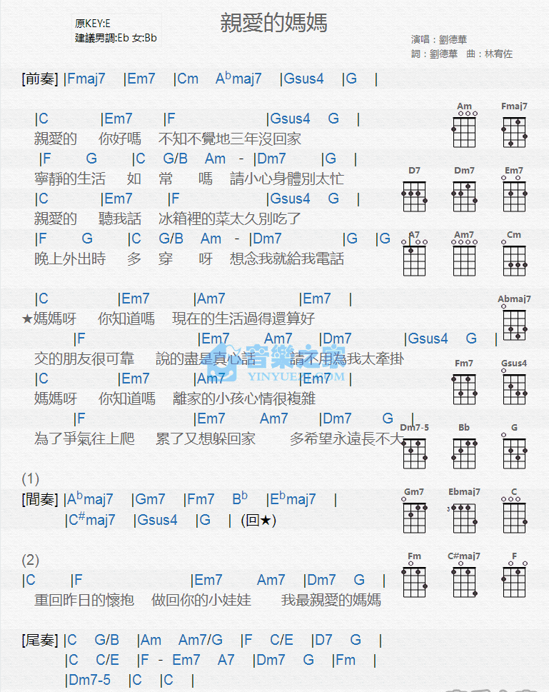 尤克里里刘德华《亲爱的妈妈》尤克里里谱弹唱版 E调和弦谱