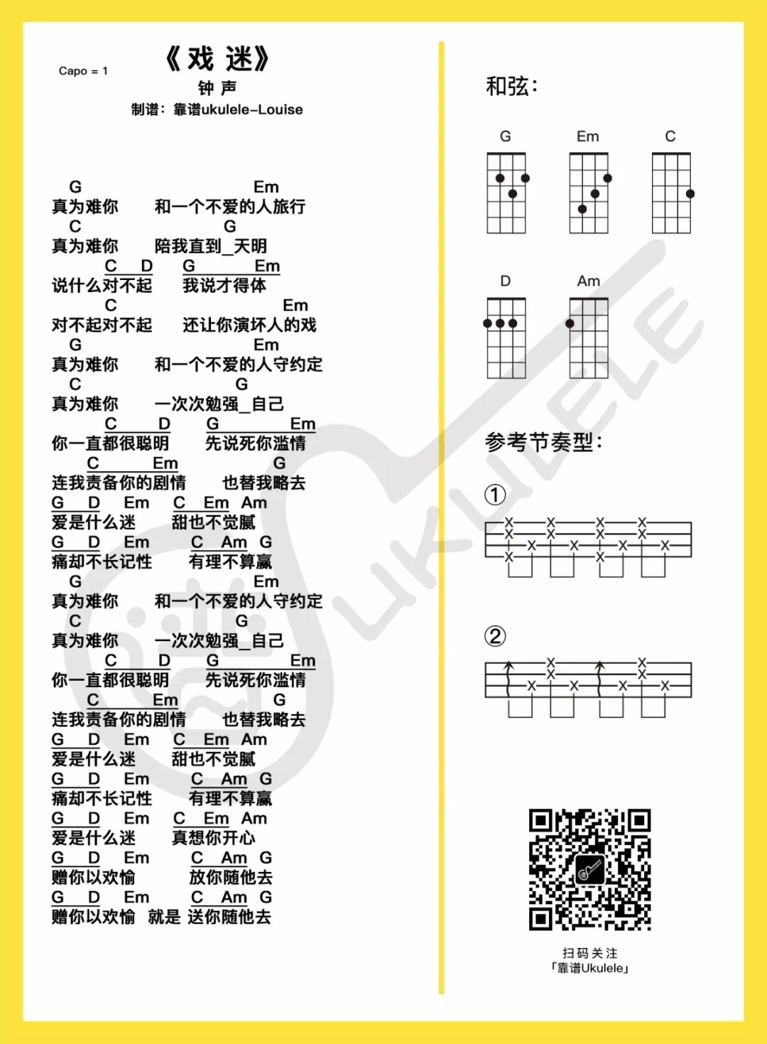 钟声《戏迷》尤克里里谱G调和弦谱...