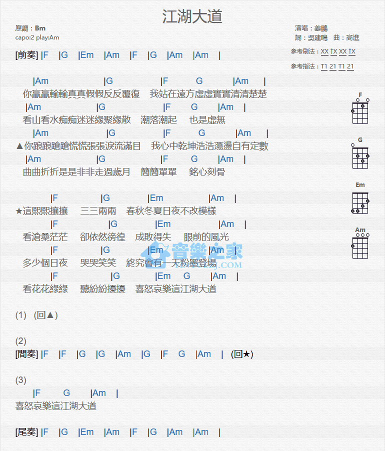 姜鹏《江湖大盗》尤克里里谱A调和弦谱...