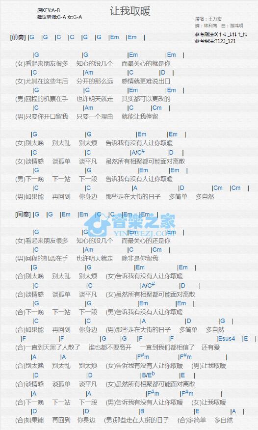 王力宏《让我取暖》尤克里里谱G调和弦版...