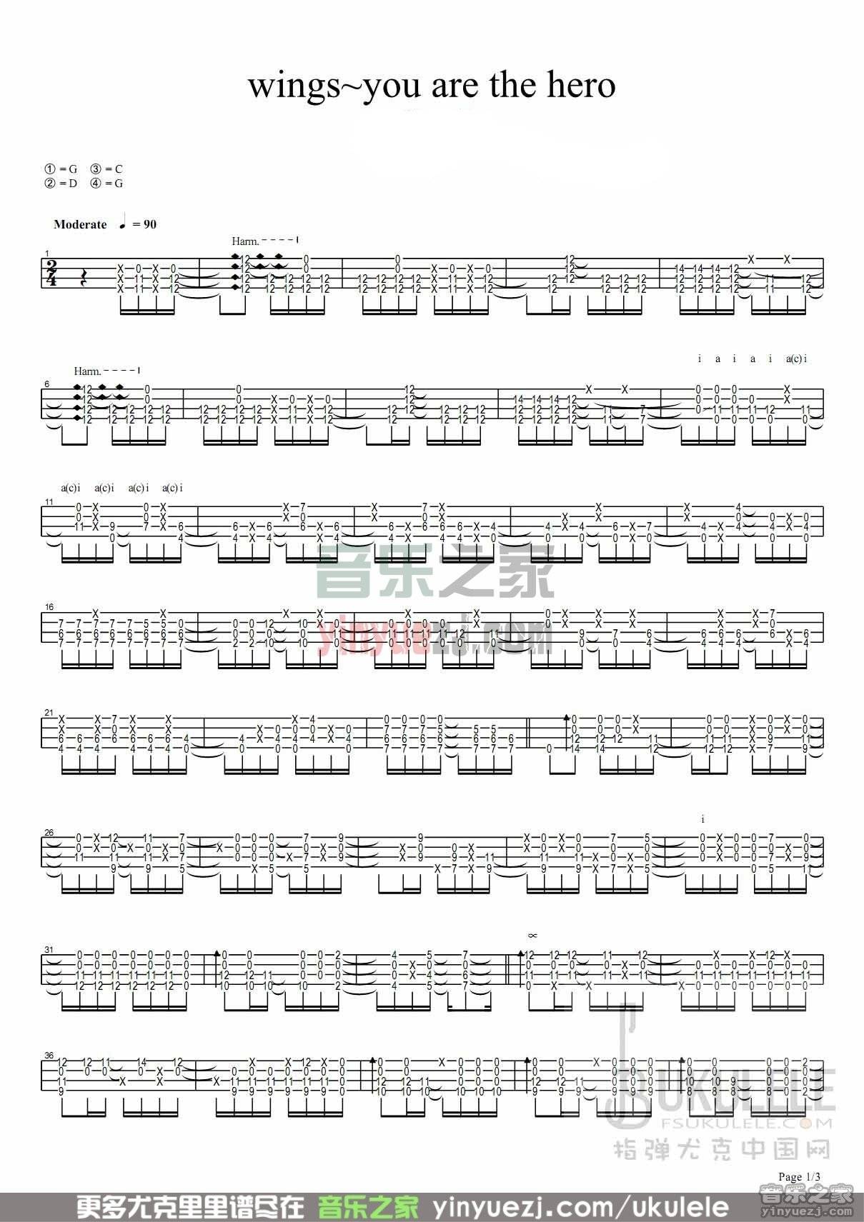 押尾桑《wingsyouarethehero》尤克里里谱指弹版G调六线谱...