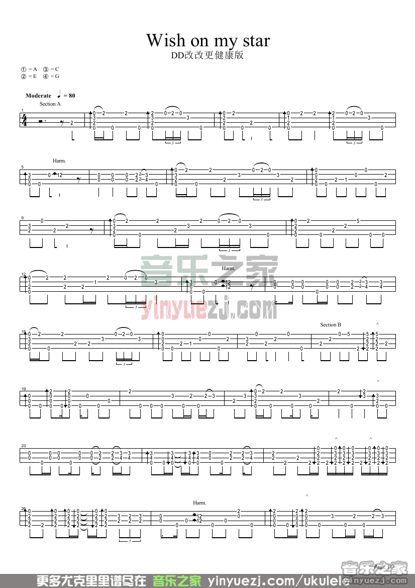 jake《wishonmystar》尤克里里谱指弹版A调六线谱__...