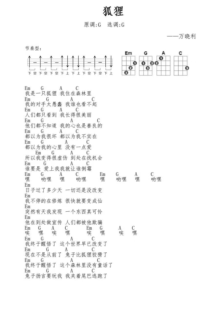 万晓利《狐狸》尤克里里谱弹唱版G调和弦谱_简单版_...