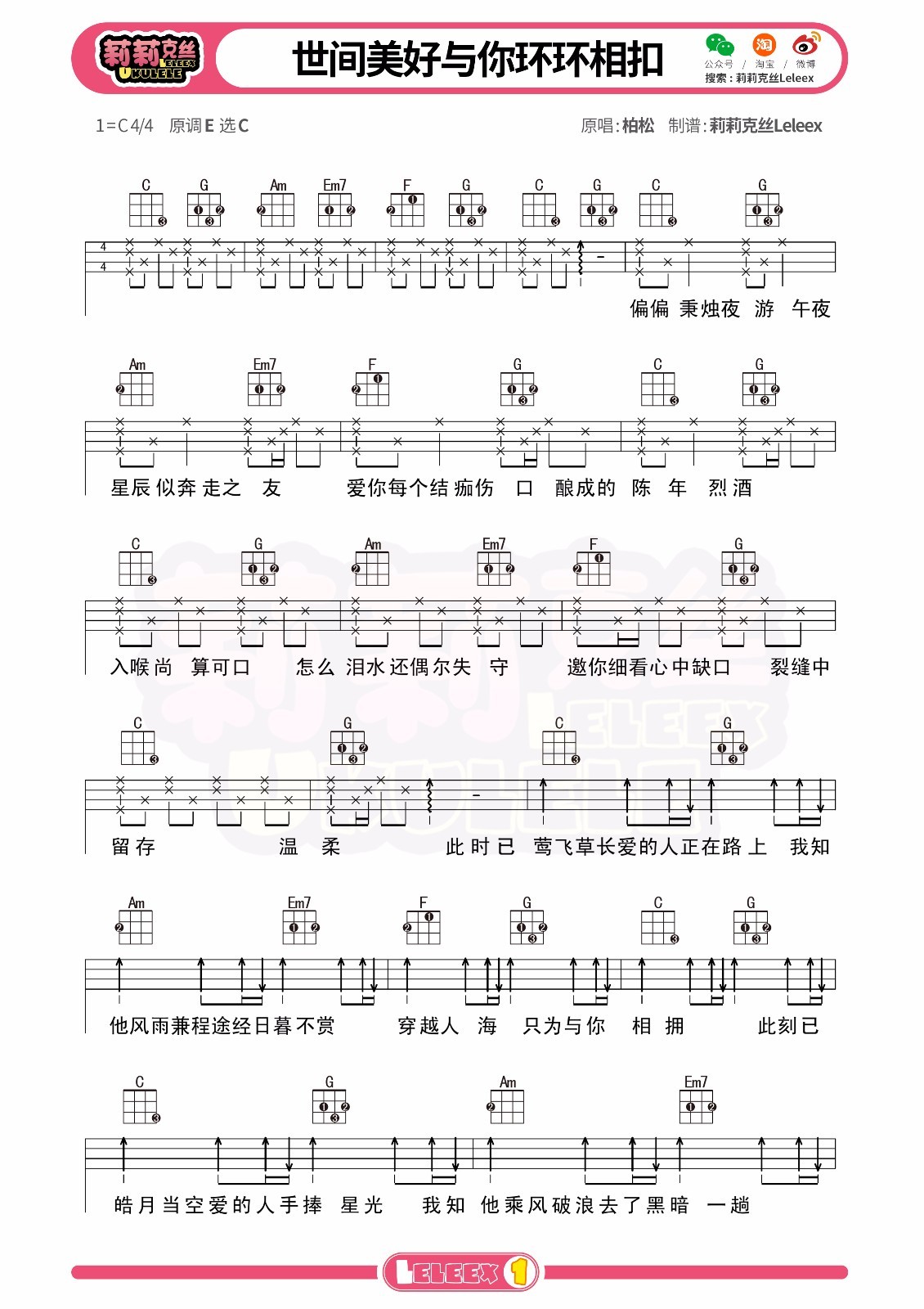 柏松《世间美好与你环环相扣》尤克里里谱C调弹唱谱...