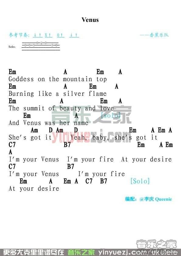 尤克里里香蕉乐队《venus》尤克里里谱弹唱版 E调和弦谱