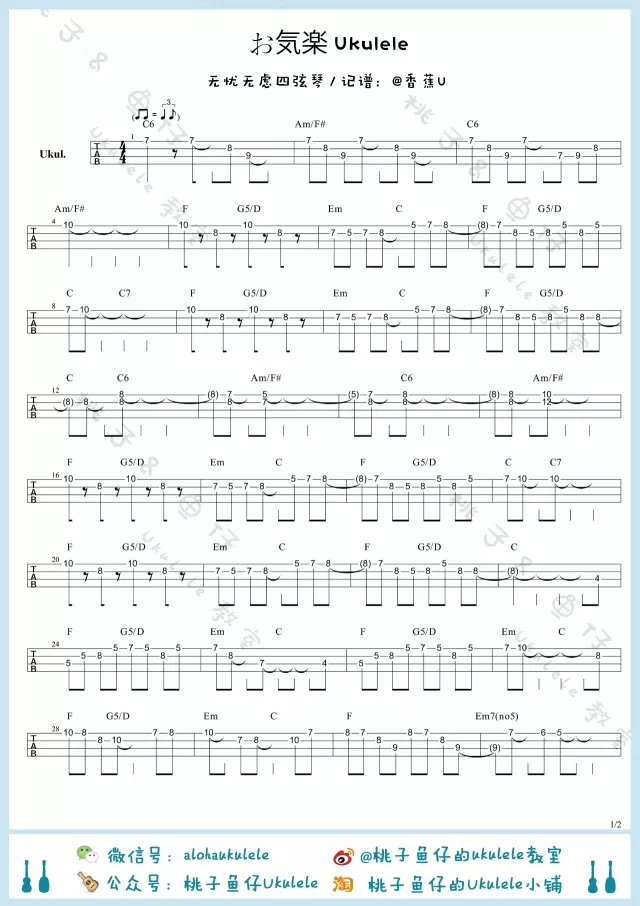 尤克里里渡辺刚《お気楽》尤克里里谱 C调指弹版
