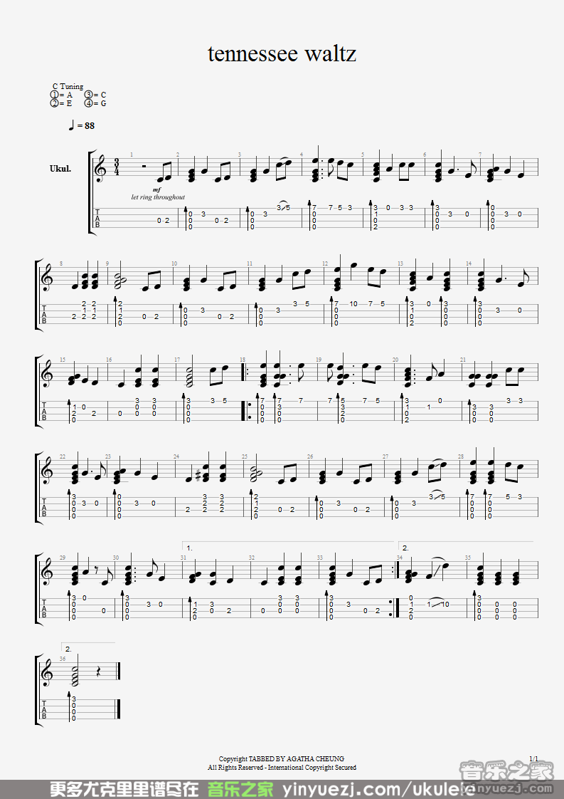 尤克里里patti page《tennessee waltz》尤克里里谱 A调指弹版