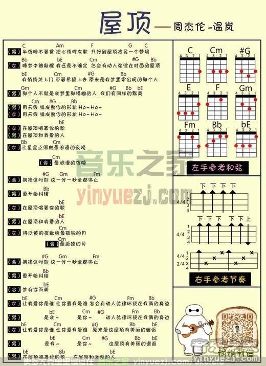 周杰伦《屋顶》尤克里里谱弹唱版C调和弦谱...