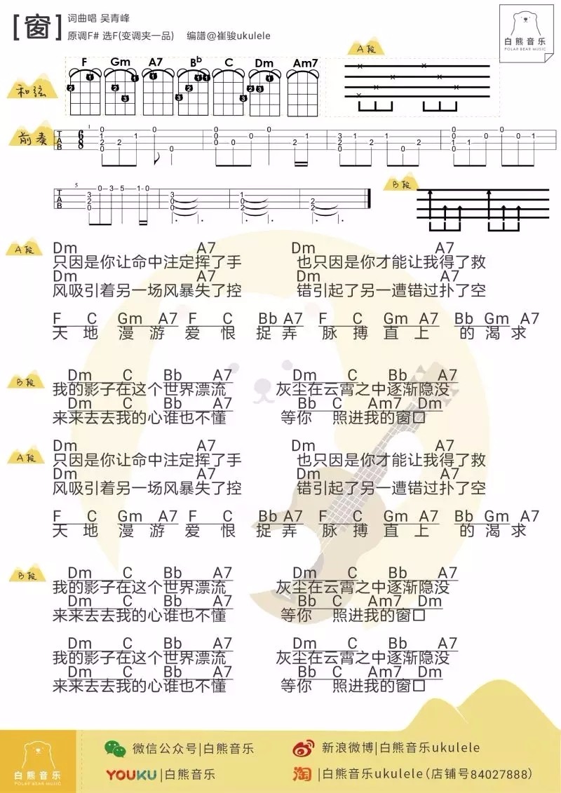 尤克里里吴青峰《窗》尤克里里谱 F调附前奏