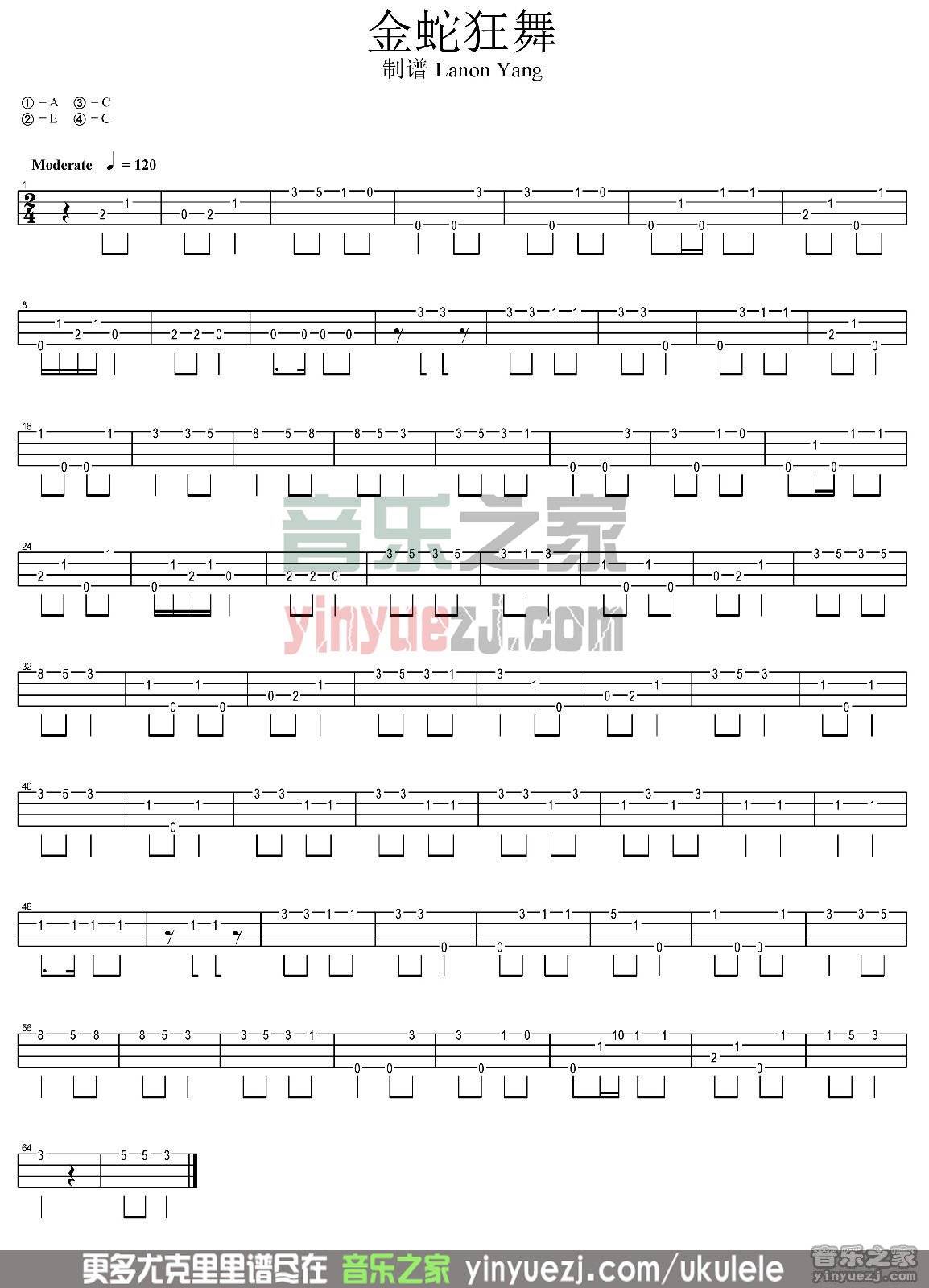 尤克里里上海民族乐团《金蛇狂舞》尤克里里谱 A调指弹版