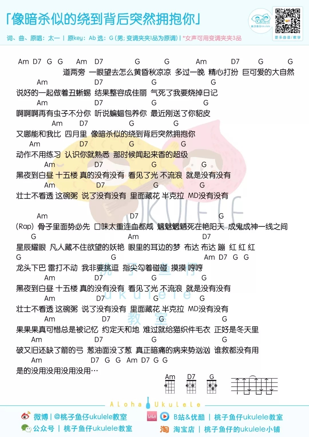太一《像暗杀似的绕到背后突然拥抱你》尤克里里谱G调和弦谱...