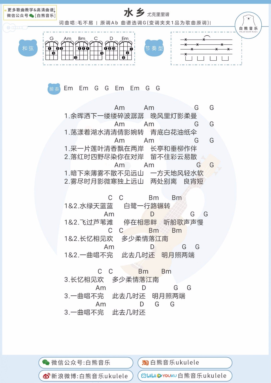 毛不易《水乡》尤克里里谱弹唱版G调和弦谱...