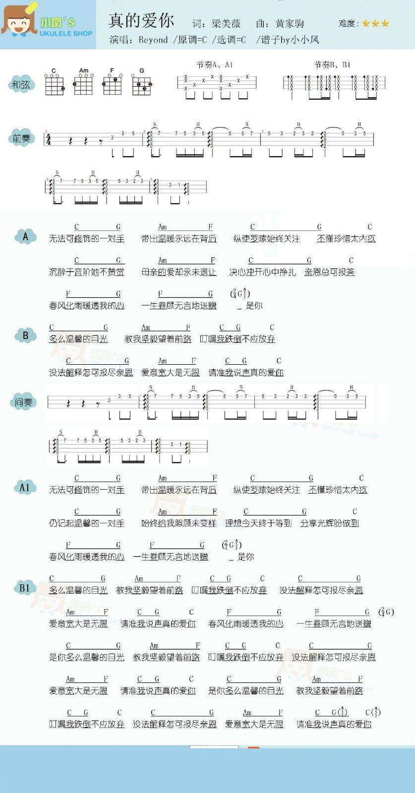 Beyond《真的爱你》尤克里里谱C调和弦谱...
