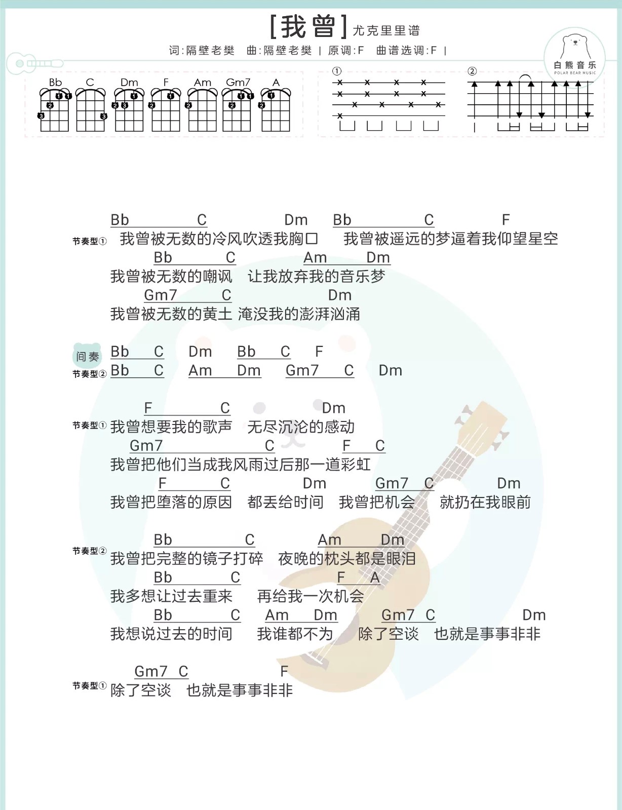 隔壁老樊《我曾》尤克里里谱F调和弦谱...