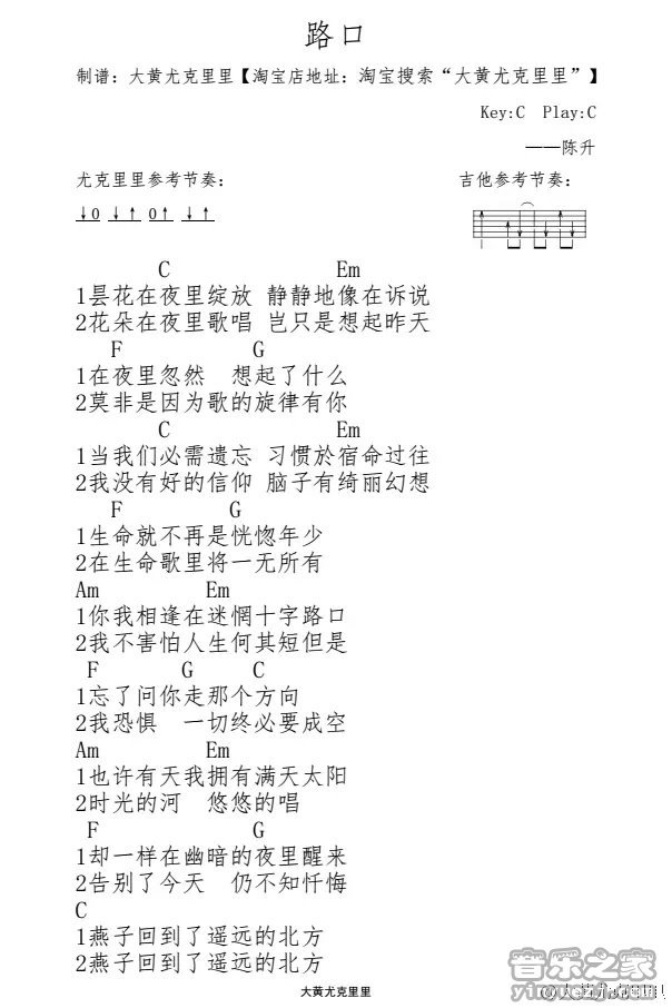 尤克里里陈升《路口》尤克里里谱 C调弹唱版