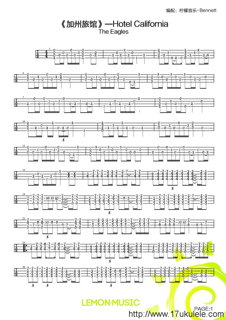 尤克里里《hotel california/加州旅馆》- the eagles 尤克里里版指弹谱