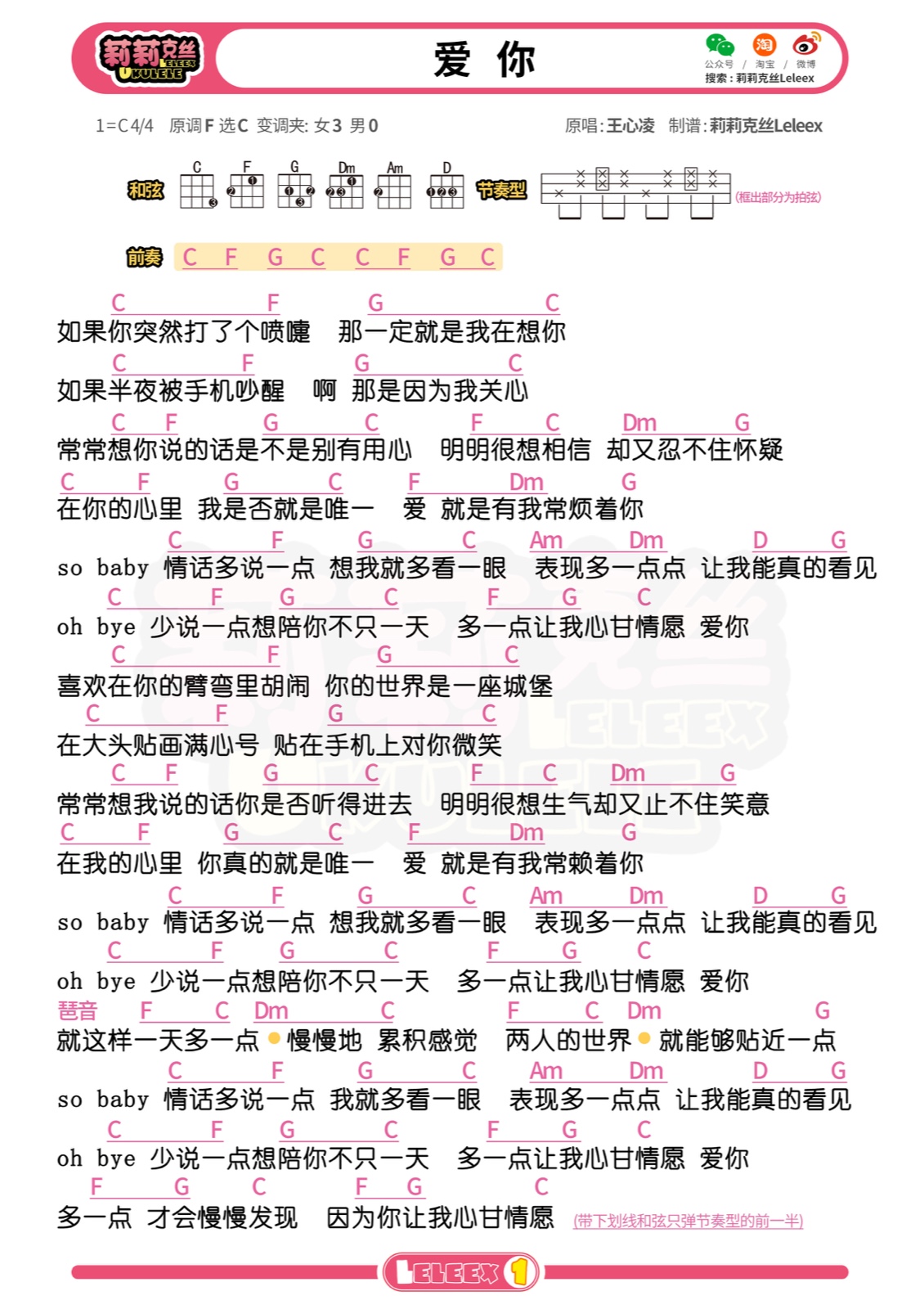 尤克里里王心凌《爱你》尤克里里弹唱曲谱