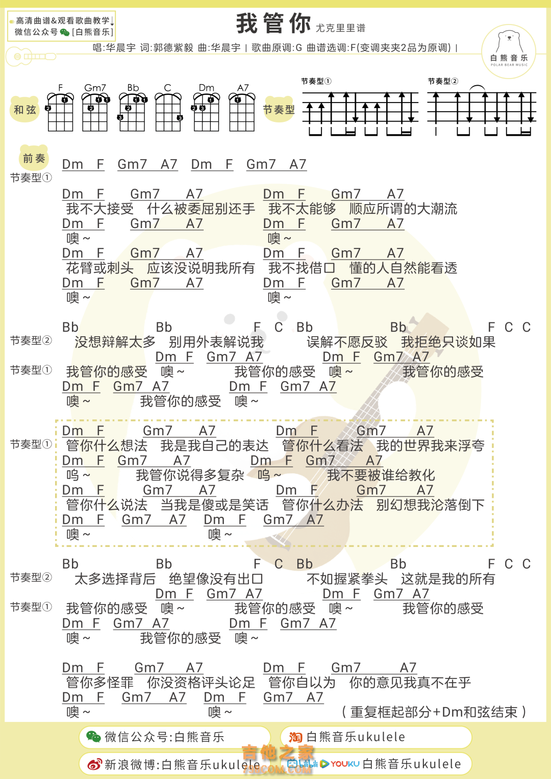 华晨宇《我管你》尤克里里弹唱谱及教学视频白熊音乐...
