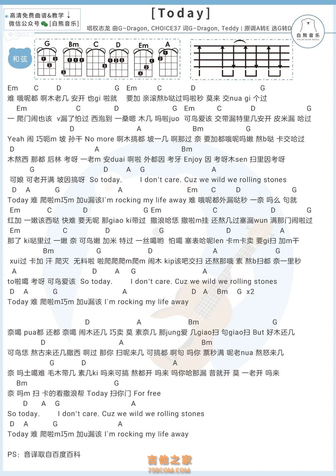 G-DRAGON《Today》尤克里里弹唱谱白熊音乐...