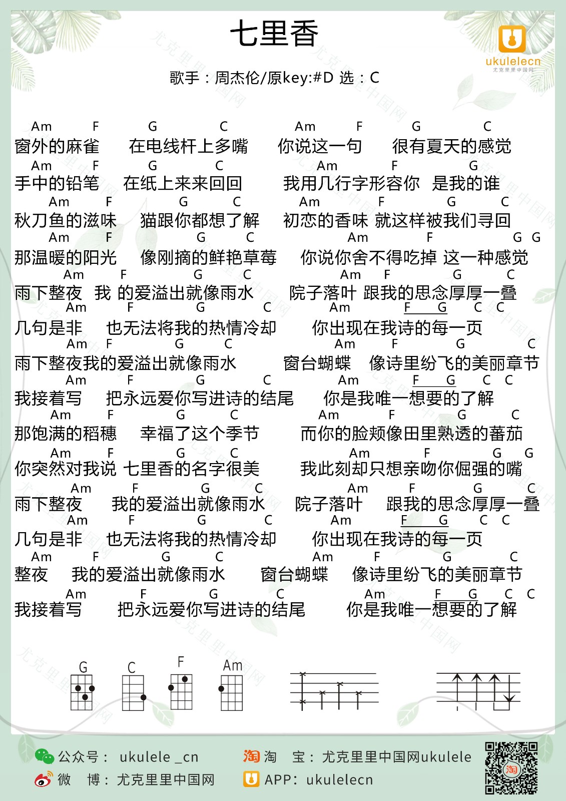周杰伦《七里香》尤克里里弹唱谱...