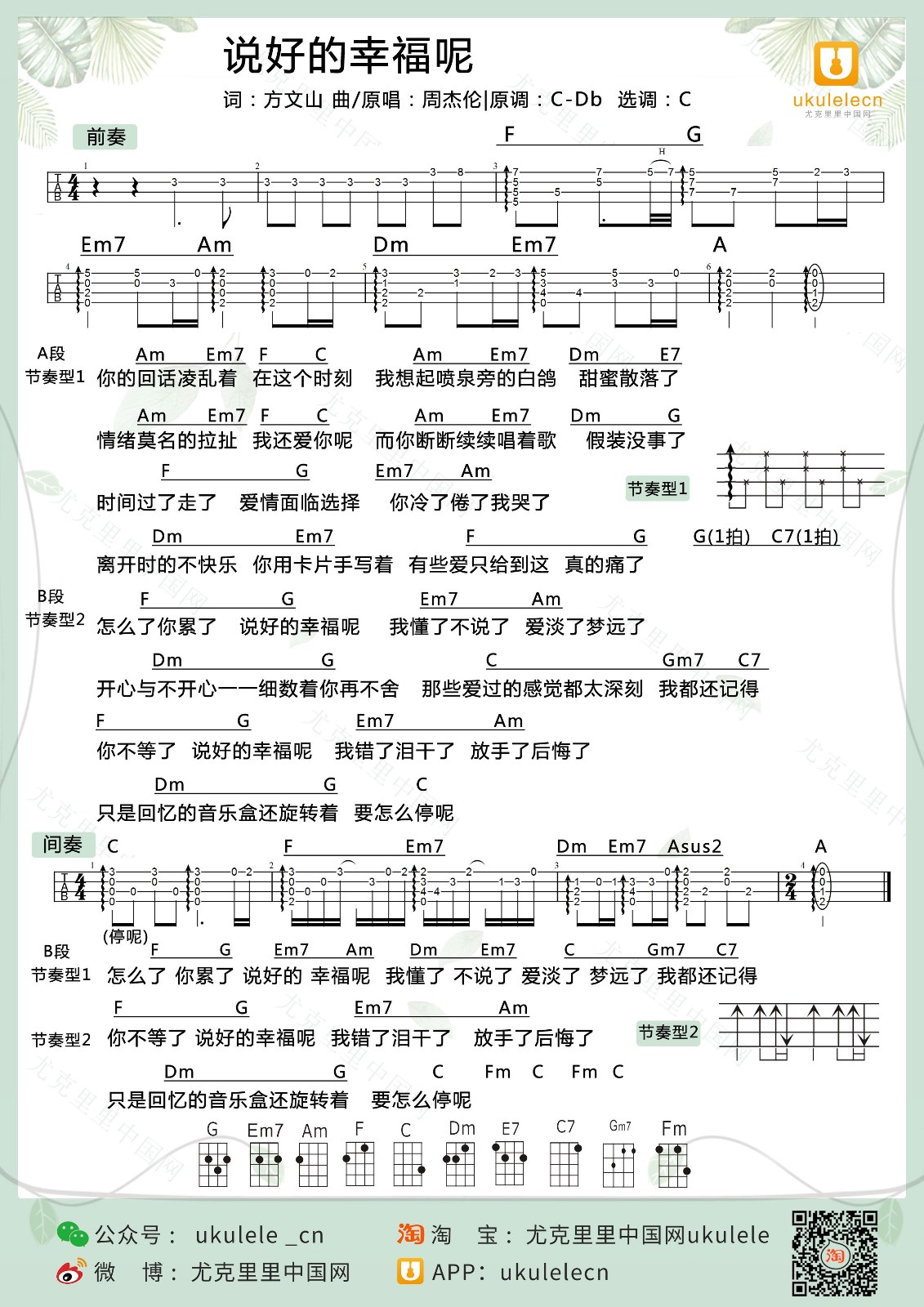 尤克里里周杰伦《说好的幸福呢》尤克里里弹唱谱