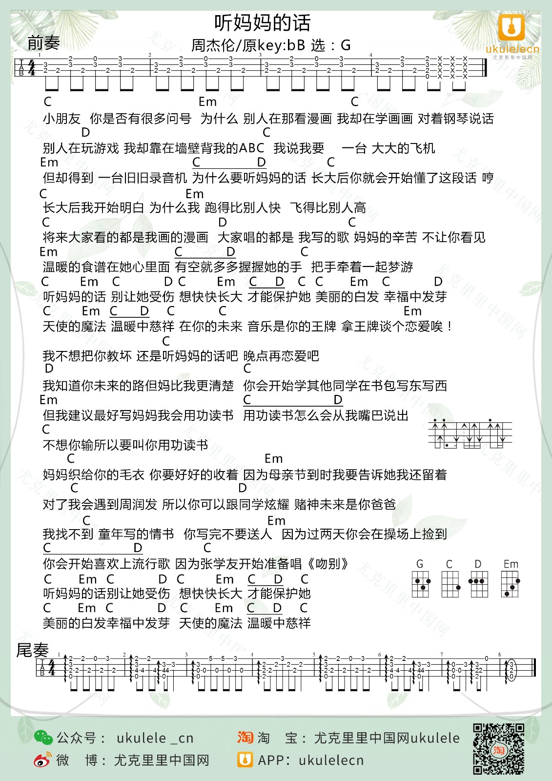 周杰伦《听妈妈的话》尤克里里谱...