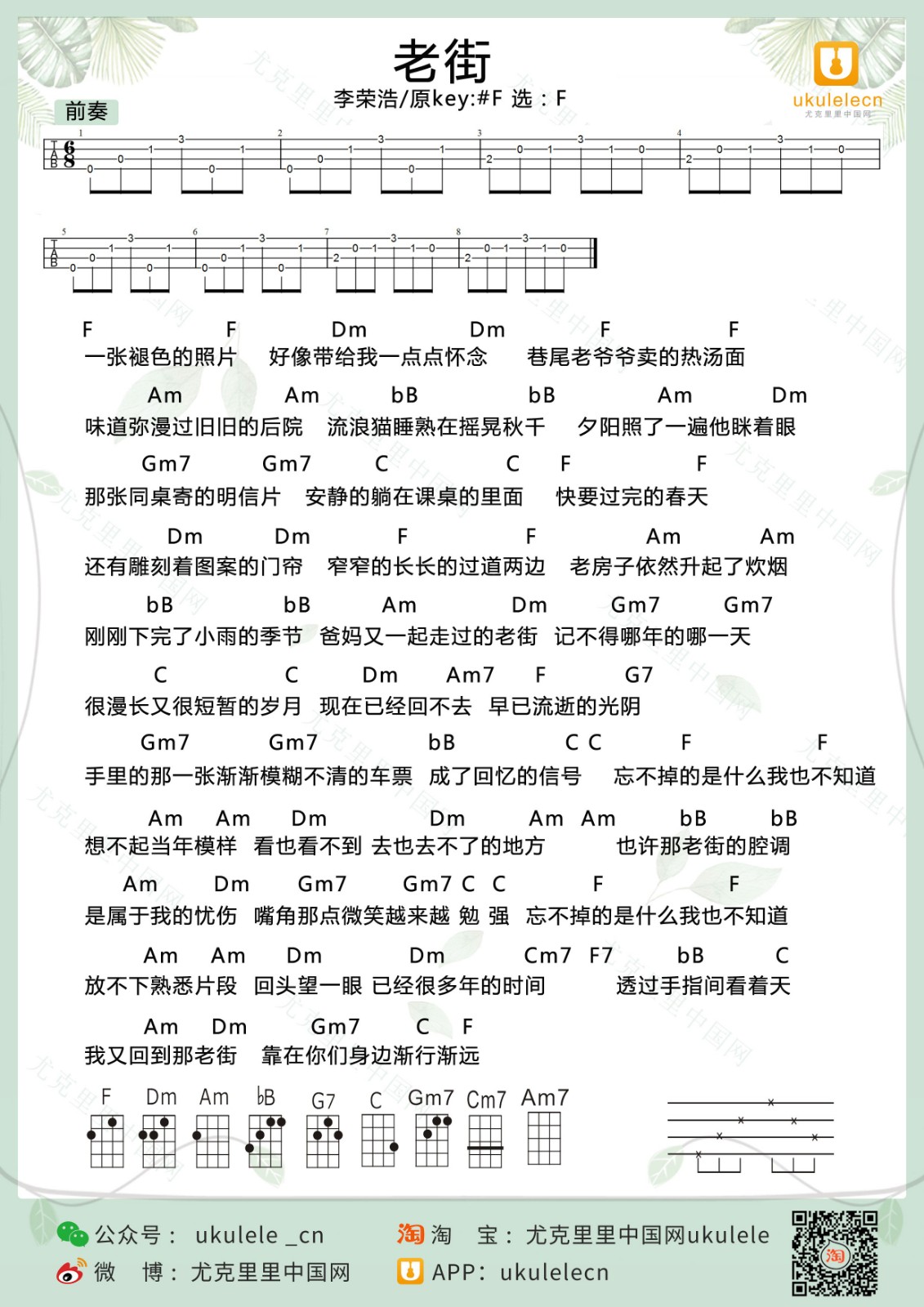 尤克里里李荣浩《老街》尤克里里弹唱谱