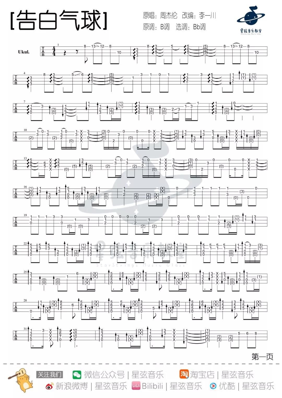 周杰伦《告白气球》尤克里里指弹谱...