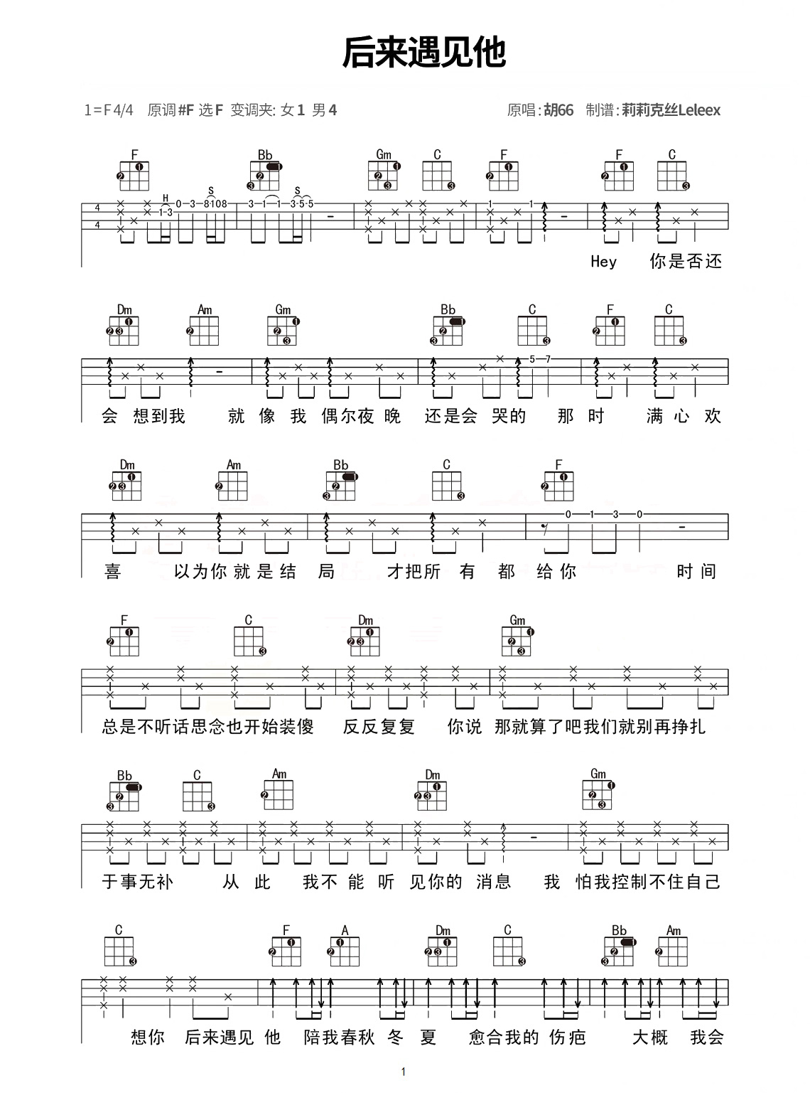 胡66《后来遇见他》尤克里里谱,共有2张高清图谱,免翻页排版设计。...