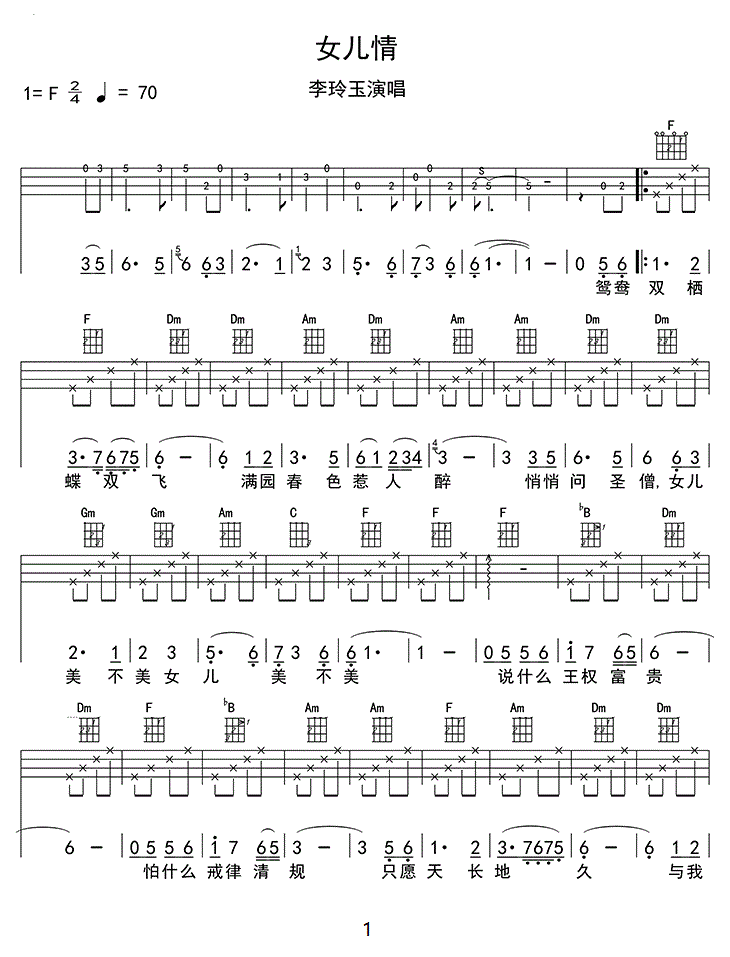 李玲玉《女儿情》尤克里里谱,共有2张高清图谱,免翻页排版设计。...