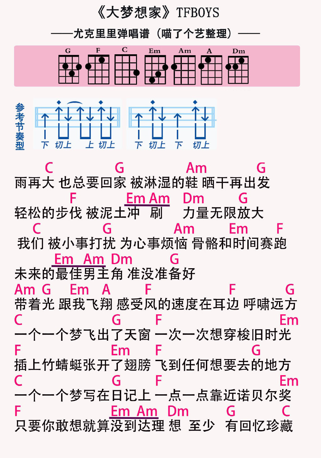 尤克里里《大梦想家》- TFBOYS 尤克里里弹唱谱 cover by 喵了个艺