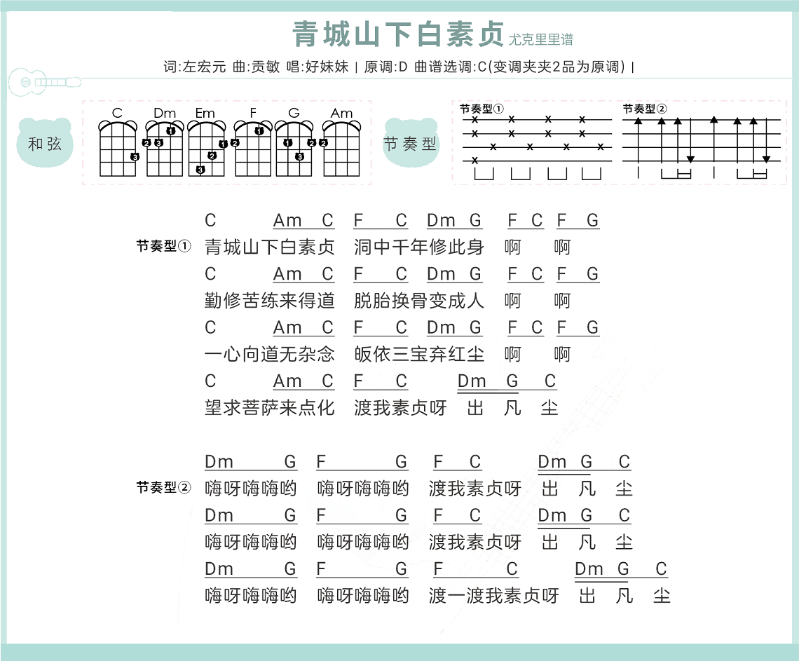 《青城山下白素贞》尤克里里谱,共有1张高清图谱,免翻页排版设计。...