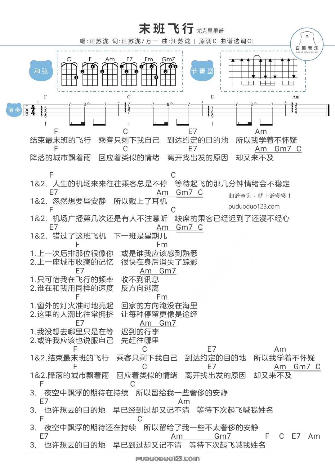 汪苏泷《末班飞行》尤克里里谱,共有1张高清图谱,免翻页排版设计。...
