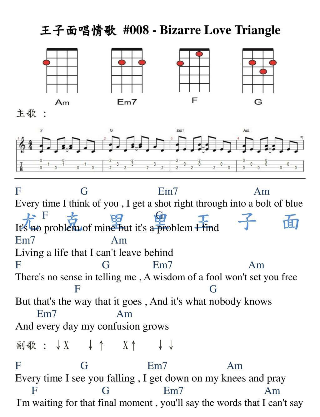《王子面唱情歌Bizarrelovetriangle尤克里里弹唱谱》尤克里里谱,共有1张高清图谱,免翻页排版设计。...
