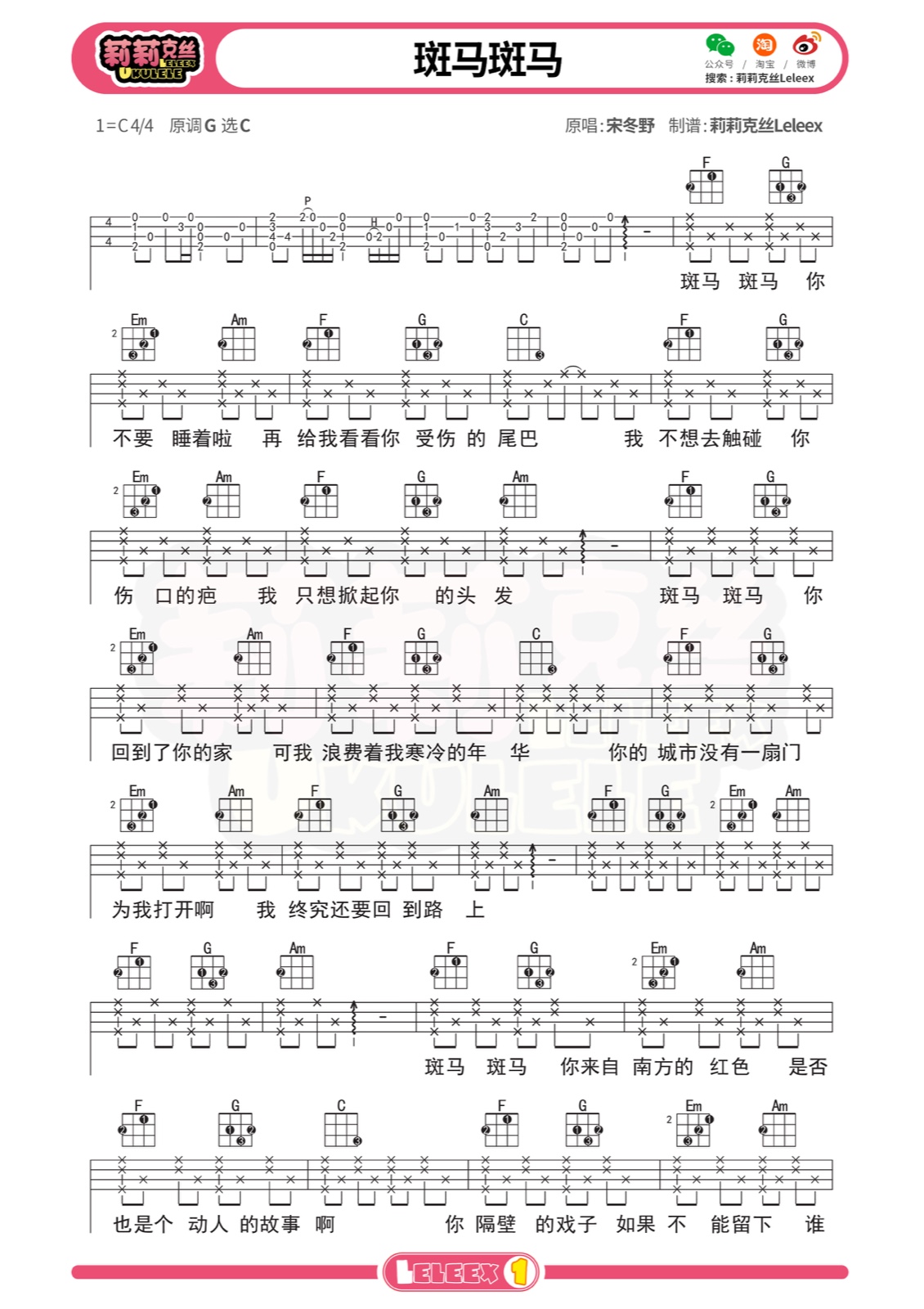 尤克里里《斑马斑马》尤克里里弹唱曲谱(标准四线谱)莉莉克丝Leleex