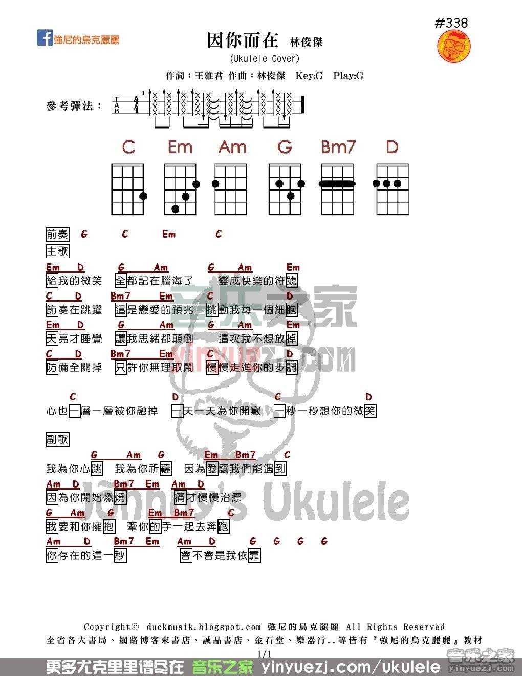 强尼版林俊杰《因你而在》尤克里里谱,共有1张高清图谱,免翻页排版设计。...
