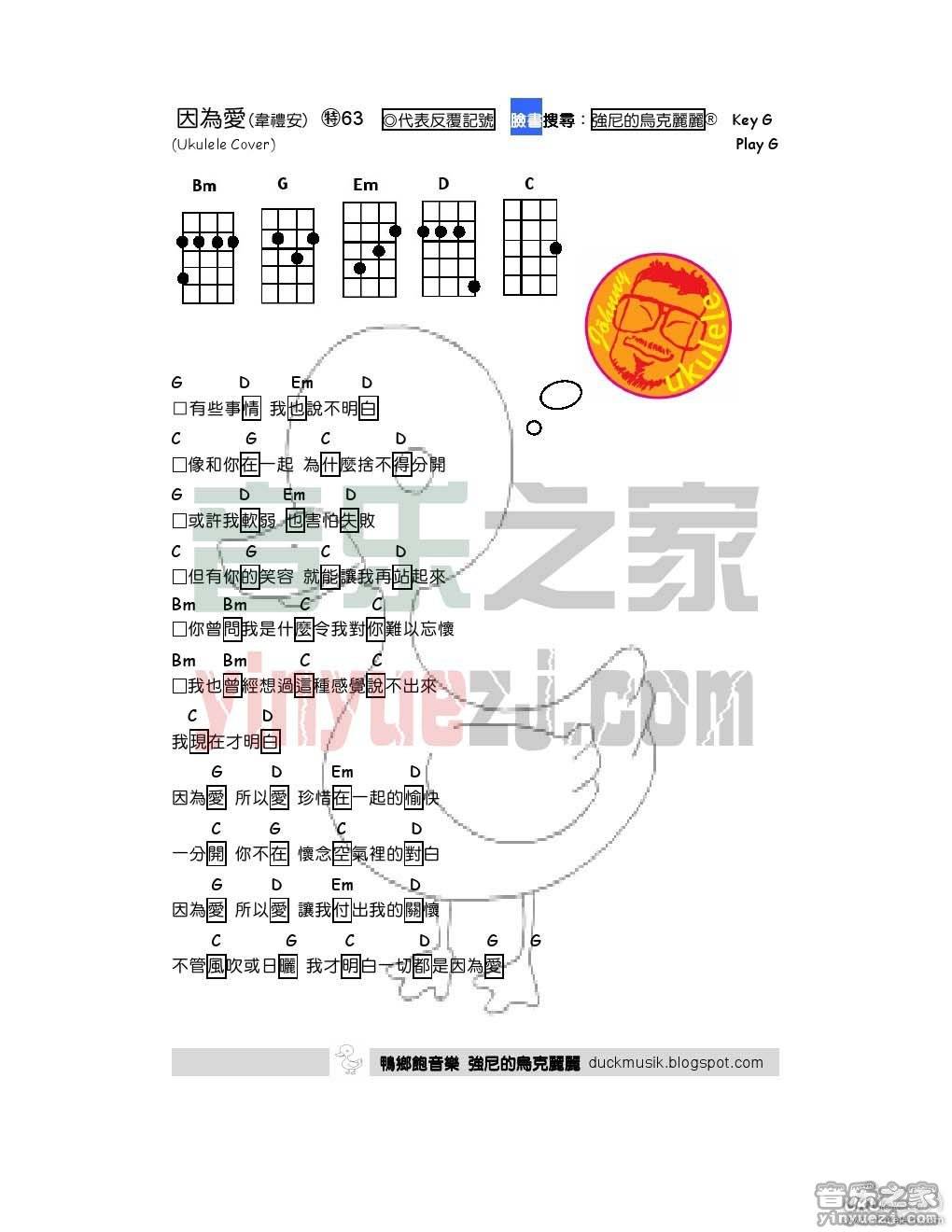强尼版韦礼安《因为爱》尤克里里谱,共有1张高清图谱,免翻页排版设计。...