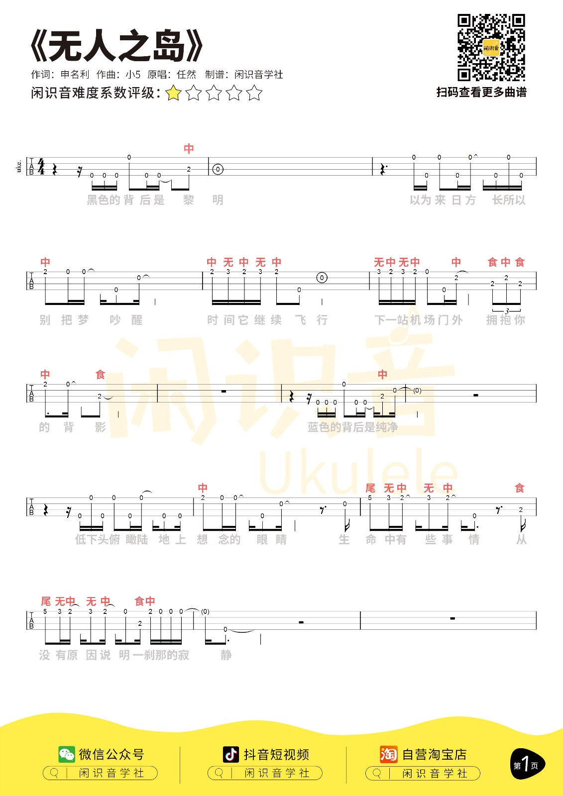 尤克里里《无人之岛》单音版尤克里里指弹谱