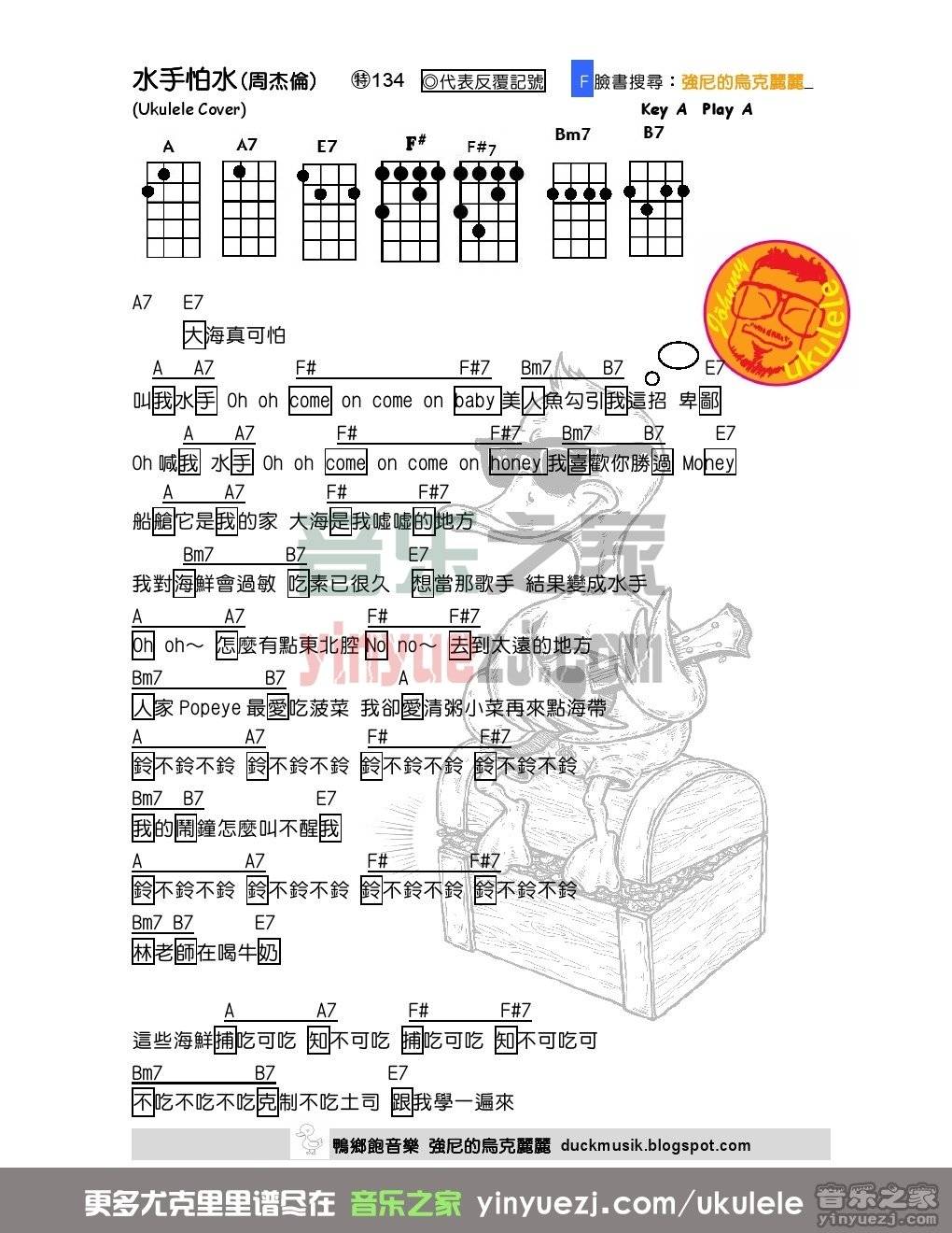 强尼版周杰伦《水手怕水》尤克里里谱,共有1张高清图谱,免翻页排版设计。...