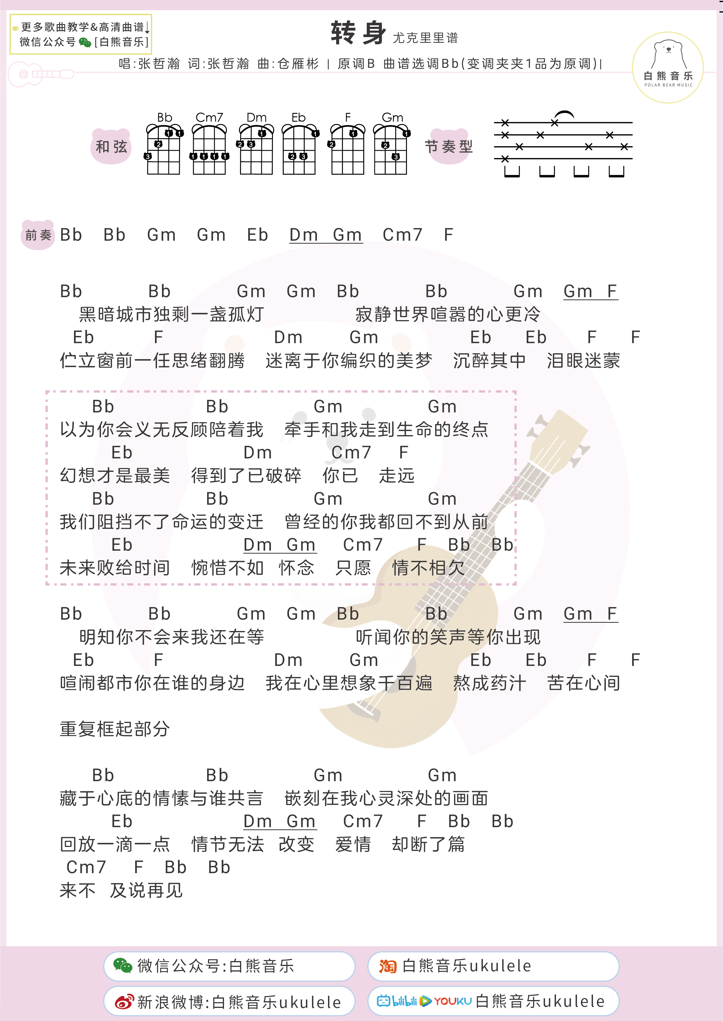 尤克里里张哲瀚《转身》尤克里里谱_bB调弹唱和弦谱_吉他谱