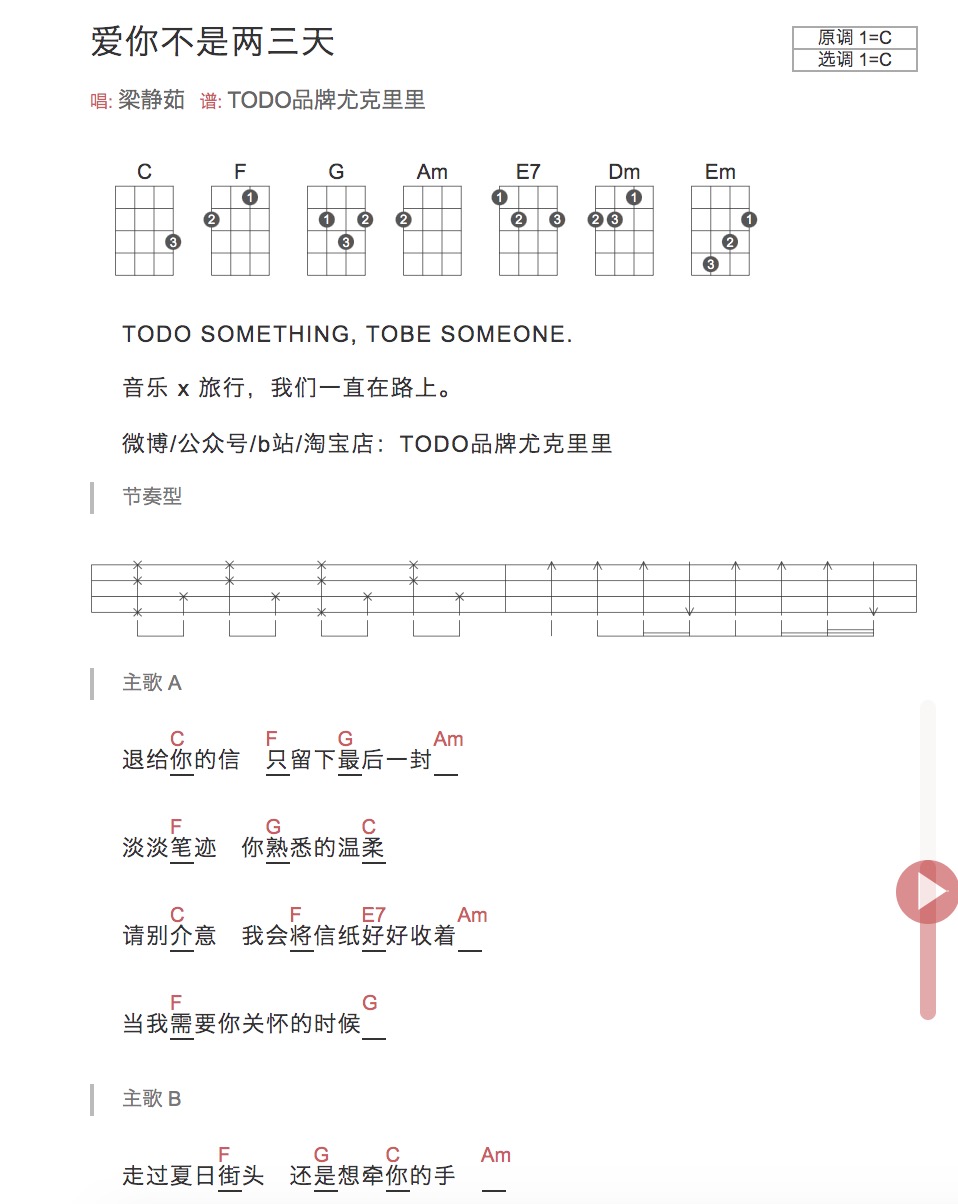 《爱你不是两三天尤克里里谱_梁静茹》尤克里里谱,共有2张高清图谱,免翻页排版设计。...