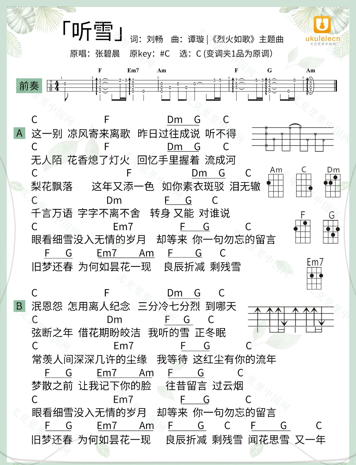 尤克里里《听雪》尤克里里谱弹唱版 C调附前奏_尤克里里中国网编配_张碧晨