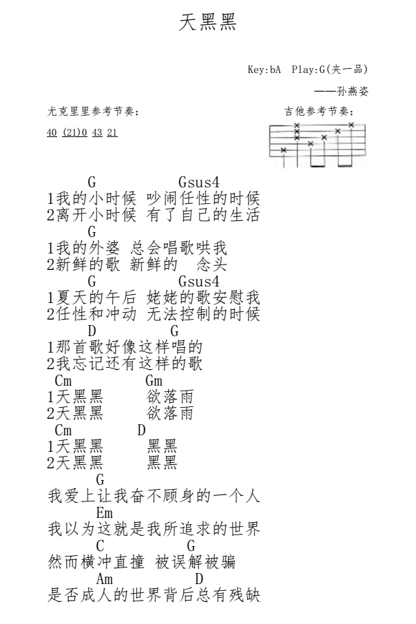 尤克里里天黑黑尤克里里简单指弹谱-孙燕姿