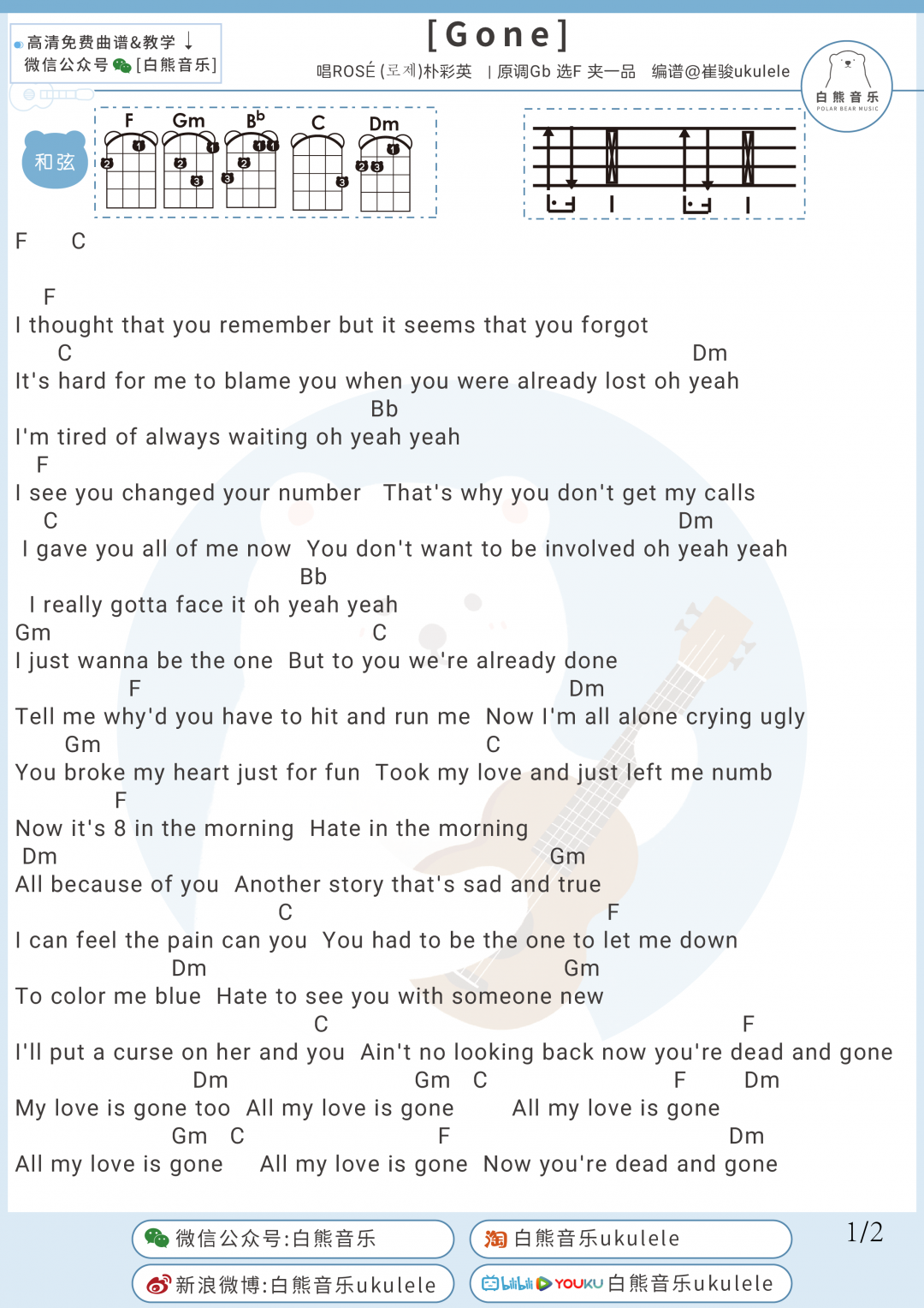 《Gone》尤克里里谱,共有2张高清图谱,免翻页排版设计。...