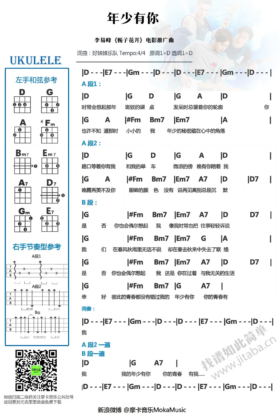 尤克里里年少有你_尤克里里谱_李易峰_栀子花开尤克里里谱