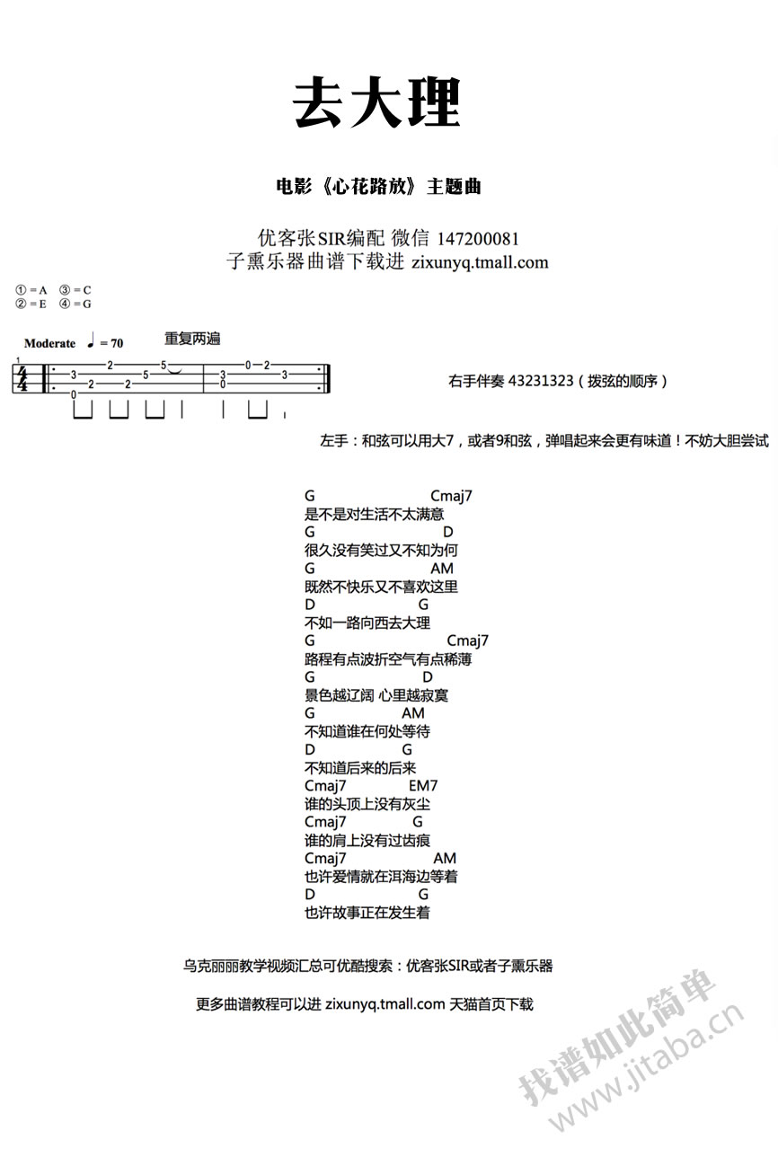 去大理_尤克里里谱_黄渤_电影《心花路放》尤克里里谱,共有1张高清图谱,免翻页排版设计。...