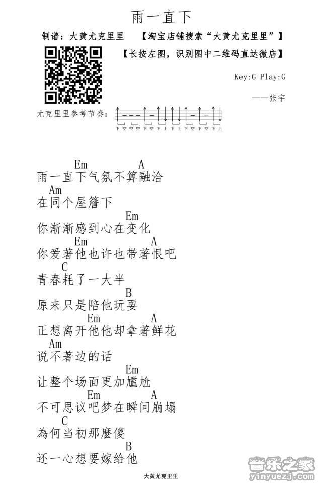 尤克里里雨一直下_尤克里里谱_张宇_弹唱谱