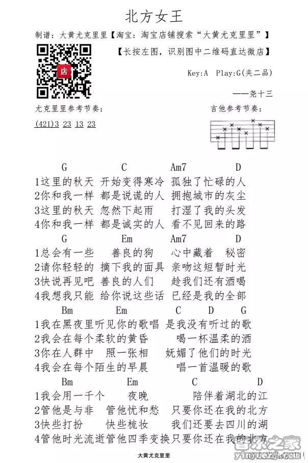 尤克里里北方的女王_尤克里里谱_尧十三_弹唱谱