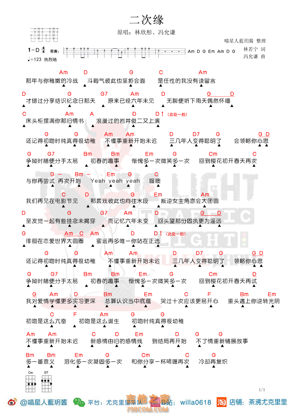 尤克里里茶沸尤克里里弹唱曲谱《二次缘(原调粤语)》-林欣彤、冯允谦